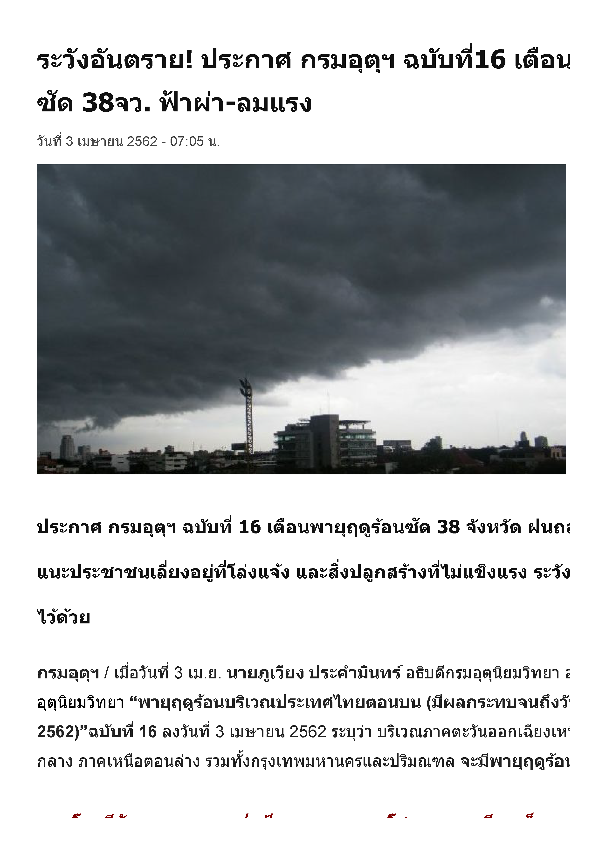 ประกาศกรมอุตุนิยมวิทยา “พายุฤดูร้อนบริเวณประเทศไทยตอนบน (มีผลกระทบจนถึงวันที่ 3 เมษายน 2562)” ฉบับที่17 ลงวันที่ 03 เมษายน 2562