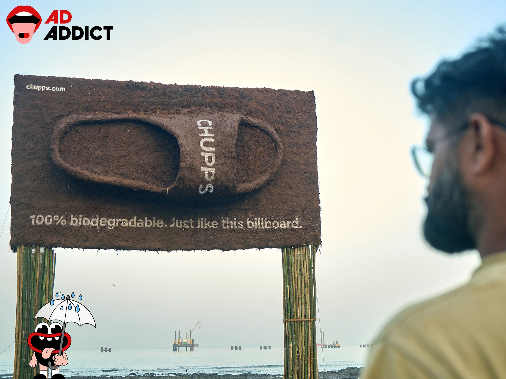 แคมเปญนี้เกิดจากความร่วมมือระหว่าง Chupps และเอเจนซี INTO Creative ที่พลิกไอเดียความยั่งยืนให้จับต้องได้แบบสุดทาง ด้วยการสร้างบิลบอร์ดขนาด 20×10 ฟุตที่ทำจากวัสดุธรรมชาติล้วน ๆ ตั้งแต่โครงไม้ไผ่ โคลน มูลวัว ฟาง ขี้เลื่อย ไปจนถึงตัวอักษรที่ใช้หินปูนสดแทนสีขาว พอฝนตกเมื่อไร บิลบอร์ดนี้จะค่อย ๆ ละลายไป เหลือเพียงโครงไม้ไผ่ไว้ให้จดจำ